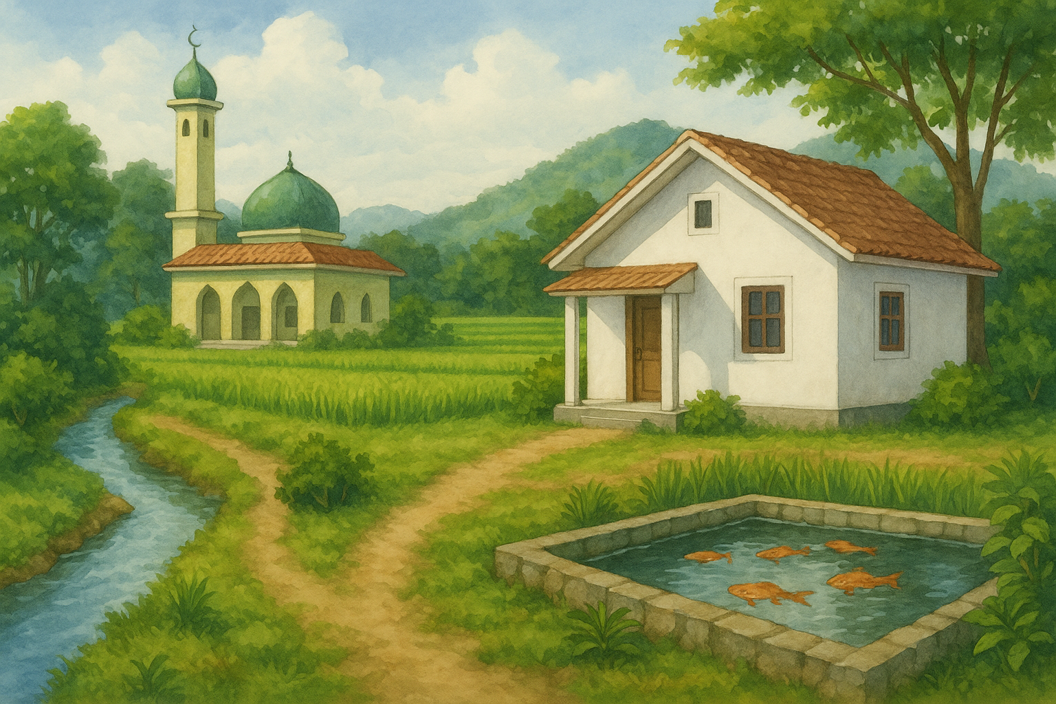 Cahaya emas jatuh di cat putih rumah, memantul di kolam ikan, dan menari di permukaan padi yang hijau.
