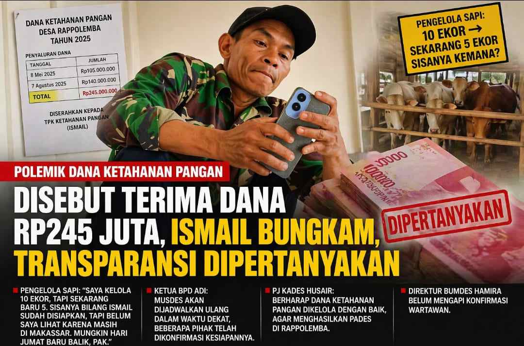 RUJUKANNEWS.com, GOWA – Polemik dana ketahanan pangan di Desa Rappolemba, Kecamatan Tompobulu, Kabupaten Gowa, kembali mencuat. Nama Ismail, yang disebut sebagai Tim Pelaksana Kegiatan (TPK), menjadi sorotan setelah tercatat menerima pengelolaan anggaran sebesar Rp245 juta.