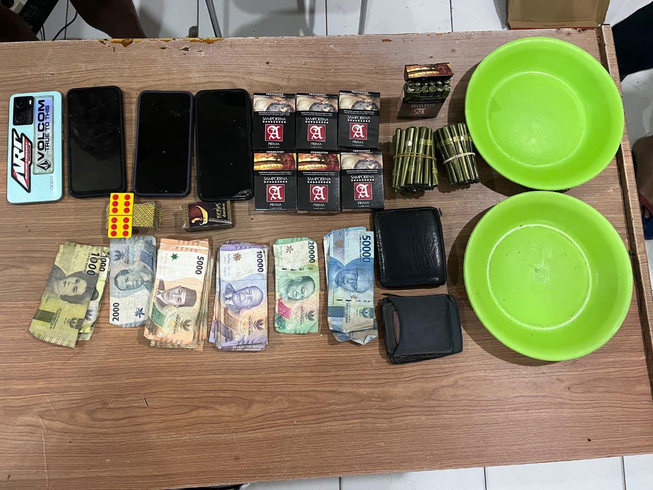 Polisi juga menyita sejumlah barang bukti berupa uang tunai pecahan berbagai nominal, satu set kartu domino merek Kris, puluhan batang dan bungkus rokok, empat unit handphone, dua dompet berisi uang tunai, serta dua piring plastik berwarna hijau.