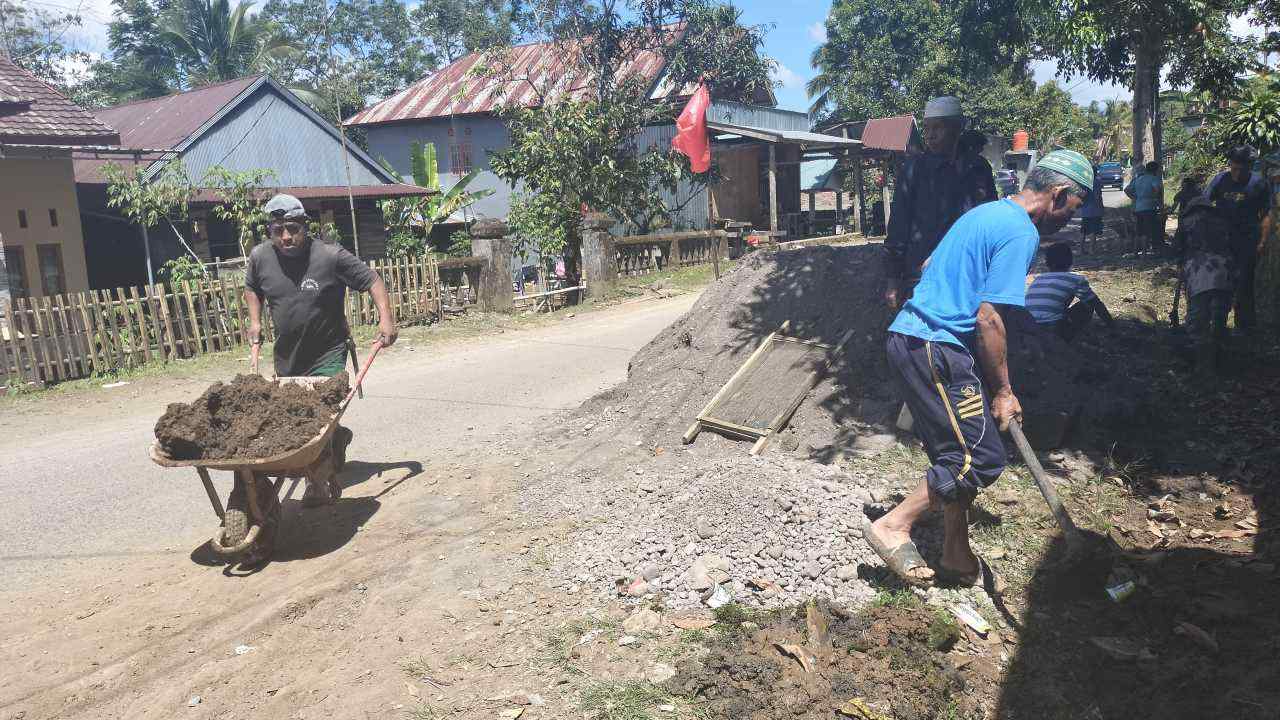 Warga Dusun Paranglompoa bergotong royong membersihkan drainase di pinggir jalan.