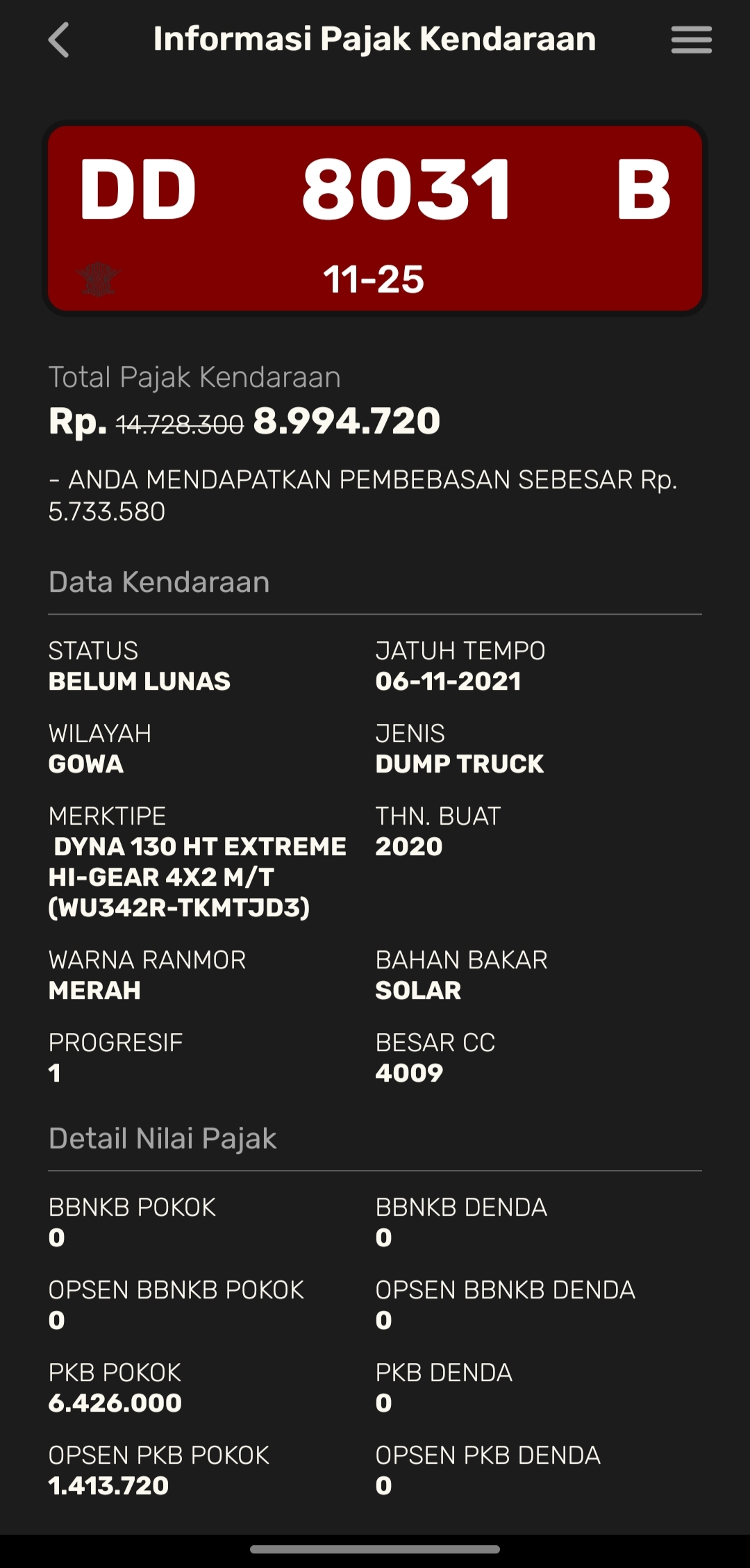 Dalam data yang tercantum, kendaraan tersebut terdaftar di wilayah Kabupaten Gowa dengan kapasitas mesin 4009 CC, dan masih berstatus belum lunas. Total pajak kendaraan yang belum dibayarkan tercatat sebesar Rp 8.994.720, dengan tanggal jatuh tempo terakhir 06 November 2021.