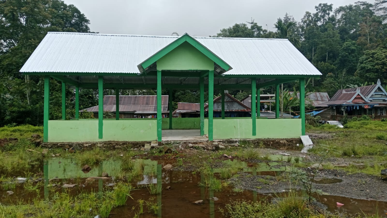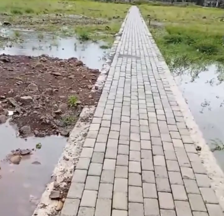 Dokumentasi proyek menunjukkan perubahan kondisi lapangan: hamparan rumput rapi sebelum pengerjaan kini tergantikan paving block sempit, talud tertutupi rumput, tribun dinilai warga asal jadi, lapangan tidak rata, dan sebagian tergenang air.