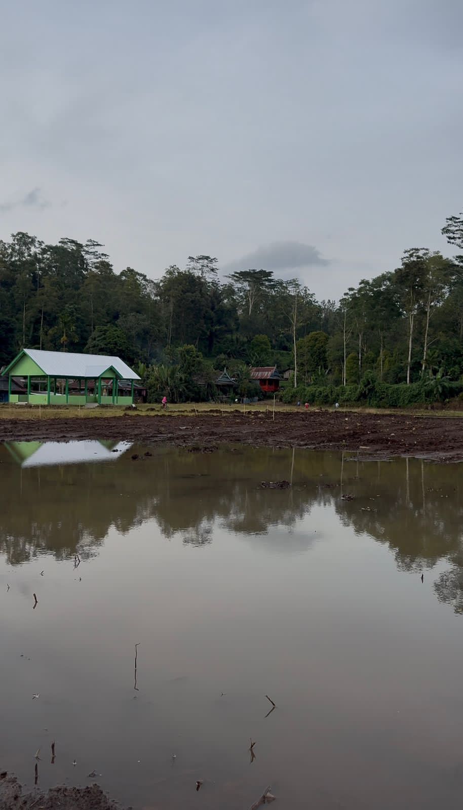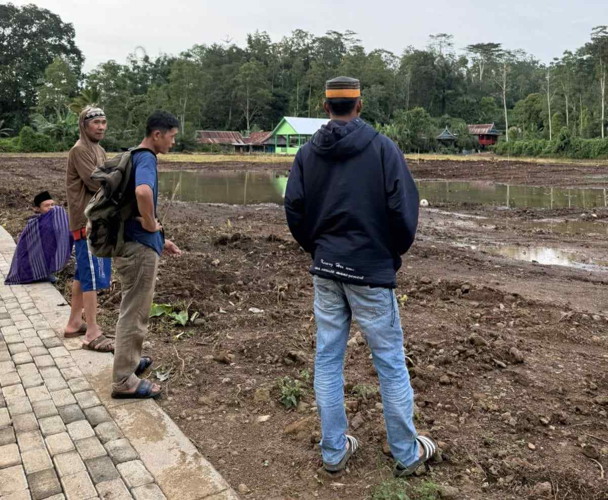 Pantauan di lokasi, Rabu (25/3/2026), kondisi lapangan belum rata. Sejumlah titik terlihat berlumpur dan dipenuhi genangan, sehingga dinilai tidak layak digunakan sebagai fasilitas umum.