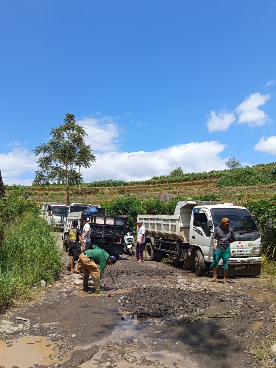 Kegiatan tersebut masih berlangsung dengan melibatkan partisipasi warga, sopir truk, serta pengendara yang melintas di jalur tersebut.